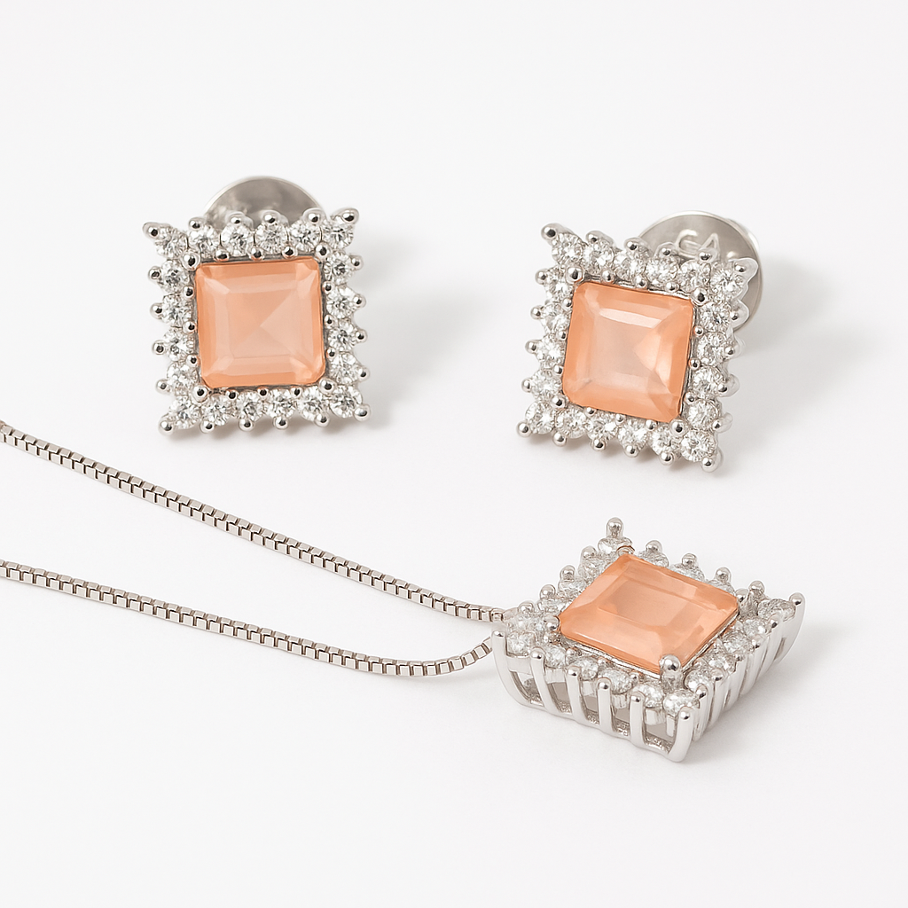 Conjunto Quadradinho com Morganita Fusion Banhado A Ródio Branco